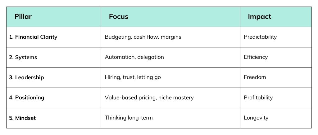 The reason most small businesses stay small is that they never fully develop all five. They grow horizontally (doing more of the same), not vertically (building systems, structure, and leverage).
